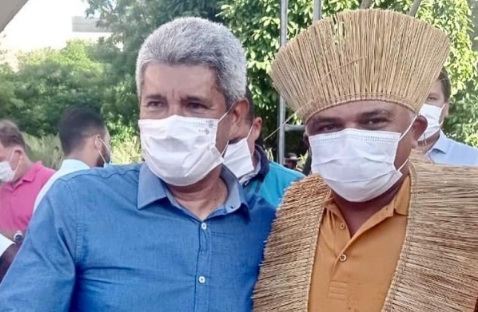 O governador indígena Jerônimo Rodrigues e o cacique Flávio Kaimbé, presidente da União dos Vereadores Indígenas da Bahia.