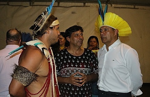 O governador eleito Jerônimo, e os conselheiros da Cespct, Kâhu Pataxó, e o jornalista Walney Magno, em evento dos indígena.